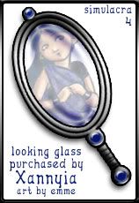 With a soft cloth in hand she picked the mirror up off of the top of the dresser and held it up only to see something strange. A face of a young girl? Setting the mirror down slowly Xannyia held her breath and shut her eyes for a moment only to reopen them and see if she was dreaming. When the figure in the mirror was still there she turned around slowly. All the while telling herself that she had known this might have happened so there was no reason to be surprised.