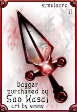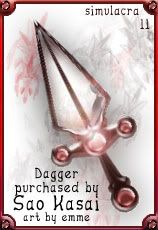 Entry 1: The Dagger Today I walked into this strange little hole-in-the-wall store that I passed by chance while I was shopping today. It just so happened that I was searching for a new dagger. My old one broke from over useage. So, I walked into this store and was browsing through the inventory, which was mostly just dusty old antiques, but I stumbled upon a very pretty dagger burried under some dainty red and black silk cloth. I usually wouldn't have purchased such an old dagger since they aren't as strong as they are when they are new, but something drew me to this dagger, I don't know what... I ended up buying the dagger and stuck it carefully in the wrist sheath I had on me. I stopped at another shop and for some reason decided to puchase this journal to write in, I don't know why I'd need too, but again something about the dagger drove me to it. I think I'll keep an eye on my precious dagger.