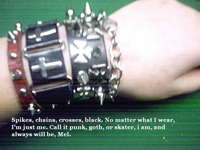 I'd like... post my newest 'anti-punk' or so to call it, pic, but it's only a pic of my wrist with the spikes and s**t.
