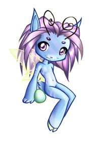 Name: Yaraif, which is the word 'fairy' inverted. Type: Unknown; Easter Special Edition Gender: None Hair: Dark Violet Eyes: Dark Violet Height: Approx. 5 in. Color and Markings: Pale blue skin, with dark violet stripes across her face, around her thighs, around her upper arms, and a single strip under her right arm. A patch of whitish blue spreads over her belly and the tips of her fingertips and muzzle are also whiteish-blue. Her legs fade from pale blue to white nearer to the hooves. Wings: Golden and translucent Hooves: Gold Positive Personality Traits: Childish (sweet, naive, friendly) Negative Personality Traits: Childish (bossy, fickle) Further Decription: Coming soon. How her Gem was Obtained: